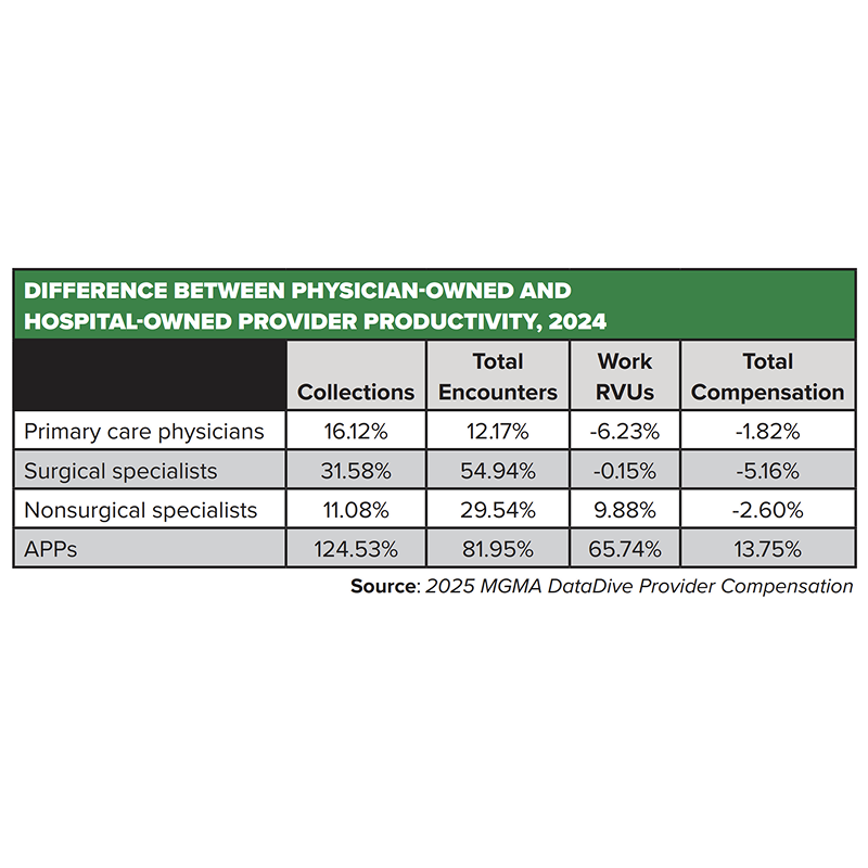 The 2024 data find providers in physician-owned practices seeing much higher total encounters and much higher collections than their counterparts in hospital-/system-owned practices, though mixed wRVUs comparatively (lower for PCPs and surgical specialists, higher for nonsurgical specialists and especially APPs) and lower total compensation (apart from APPs in private practice).