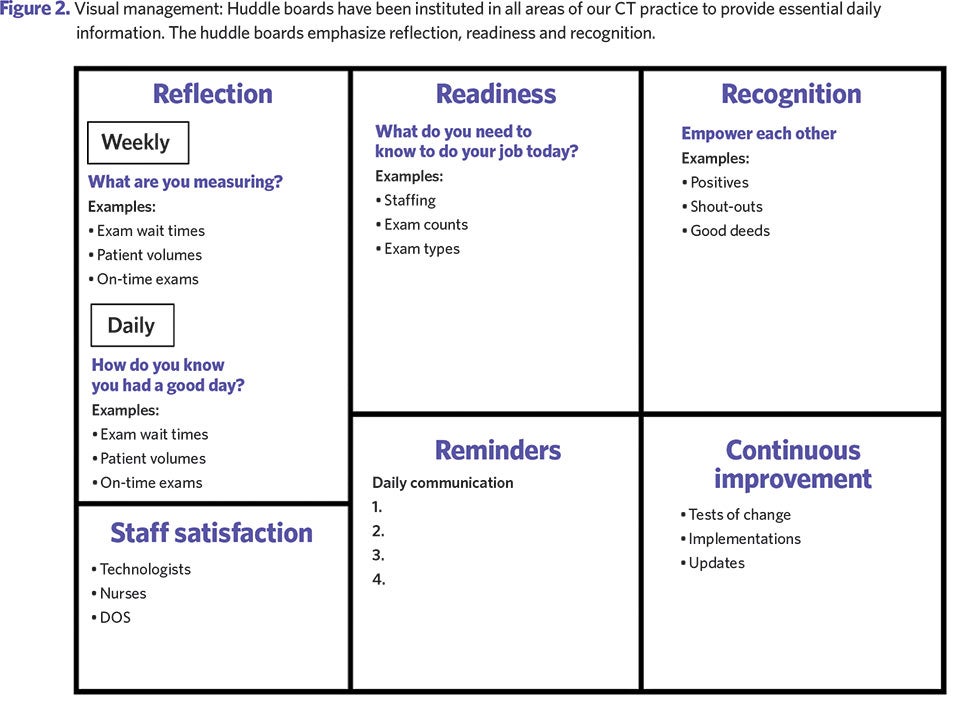 Utilizing the pillars of problem-solving and visual management, we used A3 thinking to guide our leaders to better understand root causes of organizational problems — including lack of standardization and adequate communication among groups, firefighting individual issues rather than continuous process improvement, and lack of staff engagement — to be part of the solution. Visual management tools were essential, and we learned the best approach was to keep it simple with only the key information presented in a clear way. A “vital few” electronic dashboard of graphs including year-to-year exam volumes, exam access timing, and percent of on-time exams provided a baseline to understand our current condition and facilitate identifying issues to solve. To centralize key daily information, huddle boards were implemented as an important visual tool utilized in every work area of our department (Figure 2).