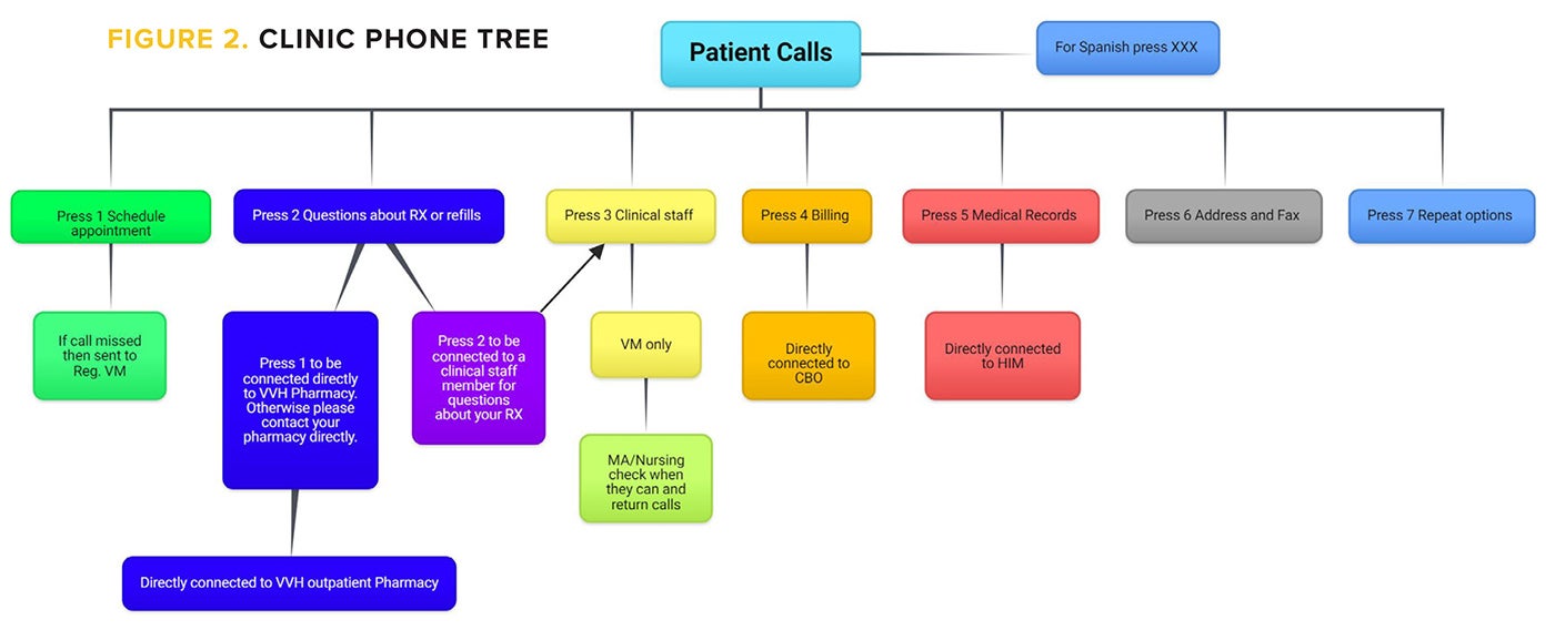 This prompted us to create a phone tree (Figure 2) for our clinics with a uniform experience and common list of selection options for patients. Drawing inspiration from two studies,1,2 our phone tree was customized to fit Valley View’s needs and implemented at all the clinics to create a uniformed patient experience, regardless of which location the patient called. This phone tree allowed patients to determine for themselves the subject or which department they would like to speak with regarding their issue, thus freeing up our clinic staff to handle check-in and scheduling. We also noticed an opportunity for keepage within our phone tree, which allowed patients to be connected directly with our pharmacy for their prescription refills. Our introductory message made patients aware of online scheduling options and upcoming events at the hospital. Additionally, we provided a Spanish option to expand access for Spanish-speaking patients.