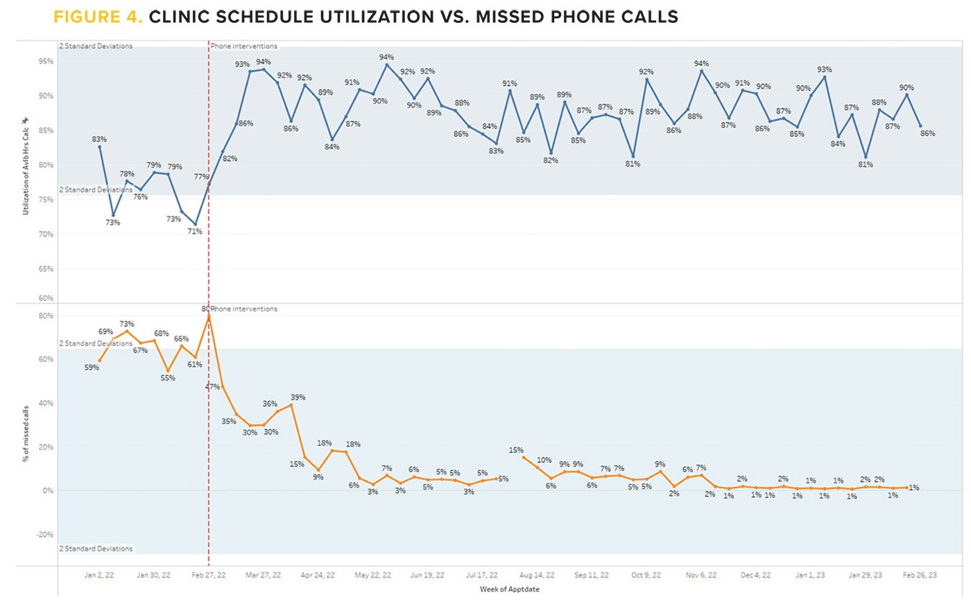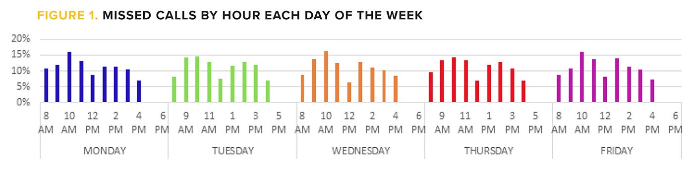 Figure 1 is an example of our Internal Medicine Clinic percentage of missed calls by hour each day. Regardless of the day, the greatest number of missed calls occurred at 10 a.m. each day. When we looked at the total number of calls coming into the clinic, we saw that 10 a.m. each day saw the greatest volume of all calls as well. The missed call percentage could be due to multiple factors, such as peak check-in times, convenient times for the patient to call, or staff assigned to other tasks. Regardless of the factors, the data showed we had to focus on the phones during these times to improve access. Interventions included strategies such as upstaffing, pausing other tasks that can be done later or simply making the back office aware that the front office’s attention would be focused on the phones during these peak hours.