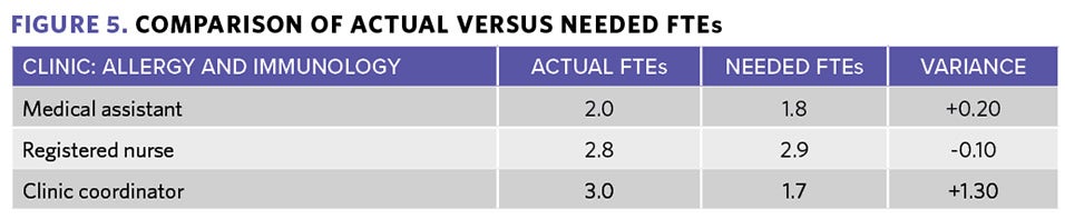 Once current and needed capacity were calculated, RUMG created a dashboard for each clinic, which compared actual versus needed FTEs, as shown in Figure 5. The variance for each clinic, positive or negative, was made available to practice and medical group leadership, and provided key management insights. These dashboards have been utilized for budgeting and hiring of staff, as well as for insight as to which clinics can share staff across multiple practices. As a practice’s visit volume increases or decreases over time, this data informs requests for additional positions.