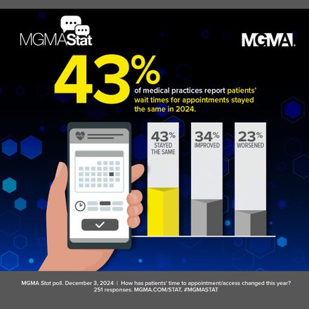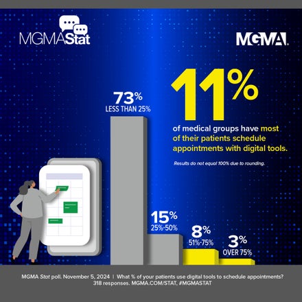 A Jan. 28, 2025, MGMA Stat poll finds that seven out of 10 (70%) of medical groups reported an increase in patient portal message volume in 2024, while 29% noted volume was about the same and only 1% reported a decrease in portal messages. The poll had 223 applicable responses.