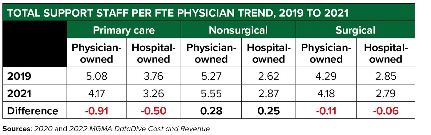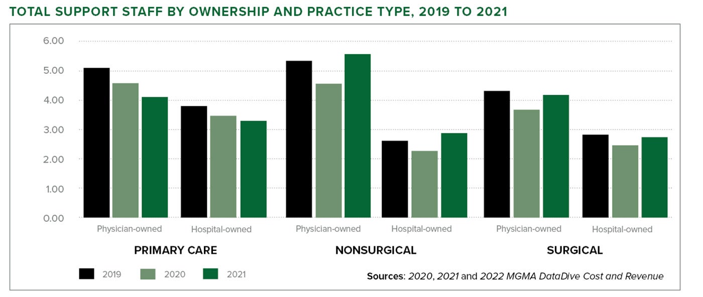 The 2022 MGMA DataDive Cost and Revenue survey data found that primary care and surgical specialty practices were below their 2019 median total support staff per FTE physician, as detailed in last year’s summary data report.
