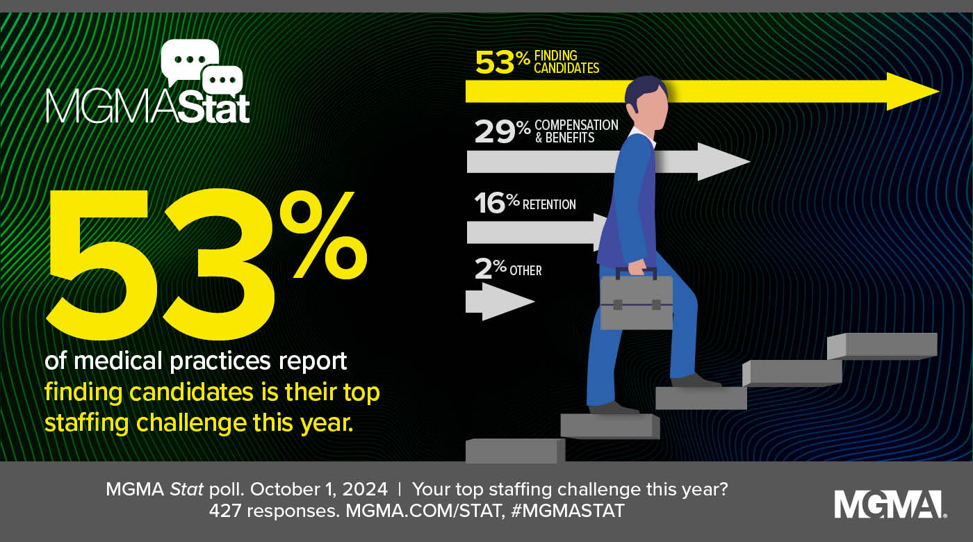 An Oct. 1, 2024, MGMA Stat poll finds that most medical group leaders (53%) point to finding candidates as their top staffing challenge this year, ahead of compensation and benefits (29%), retention (16%) and “other” (2%). The poll had 427 applicable responses.