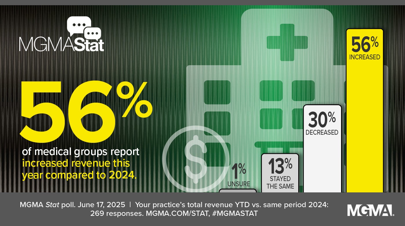 A June 17, 2025, MGMA Stat poll found that only 56% of medical group leaders reported year-to-date revenue increases relative to the same period in 2024. Another 13% said revenue was about the same, while three out of 10 (30%) reported a decline. One percent were unsure. The poll had 269 applicable responses.