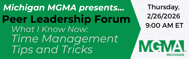 Join us for Michigan MGMA’s Peer Leadership Forum, where you can connect with board members, share challenges, and exchange ideas with fellow medical group managers on February 26, 2026 at 9:00 AM ET. This session will spotlight practical time management tips and tricks tailored for busy healthcare leaders to help you prioritize effectively, streamline workflows, and stay focused amid competing demands. It’s an open space to learn more about the chapter, gain valuable insights, and walk away with strategies you can immediately put into practice.