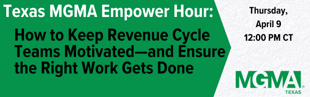 Join us for Texas MGMA’s Empower Hour, an interactive session designed to bring medical group leaders together to connect with chapter leadership, share challenges, and exchange best practices. This April session will focus on building practical, sustainable motivation within revenue cycle and operations teams, exploring what truly drives performance beyond traditional pep talks. Participants will discuss how clearly defining what “working” looks like through meaningful metrics and transparent scoreboards can strengthen accountability, as well as how to design workflows that make the right work unavoidable without constant oversight. The conversation will also explore ways to sustain motivation through recognition, growth opportunities, and greater ownership of work, while sharing practical coaching strategies to address underperformance quickly and keep teams performing at a high level.